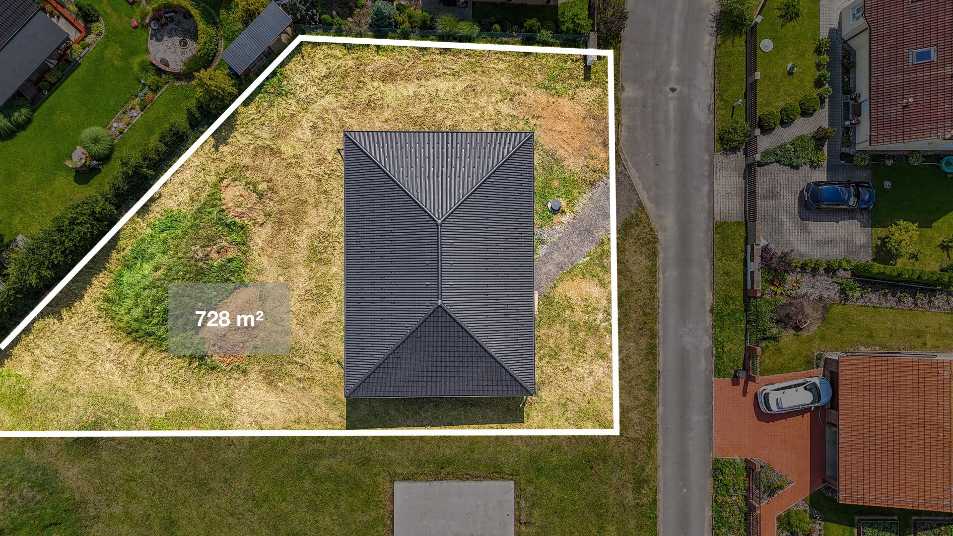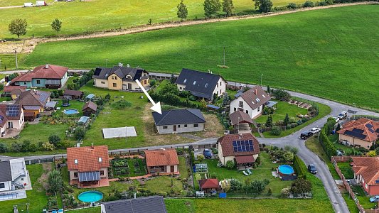 Samostatně stojící rodinný dům má dispozici 4+KK a podlahovou plochu 105 m2. Je přízemní, s půdním prostorem na uložení věcí. Pozemek má výměru 728 m2.