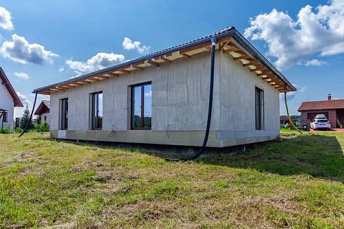 Dům je postaven z cihelných keramických bloků. Je zatím nedokončený, nabídková cena v inzerci je za dokončenou stavbu domu.